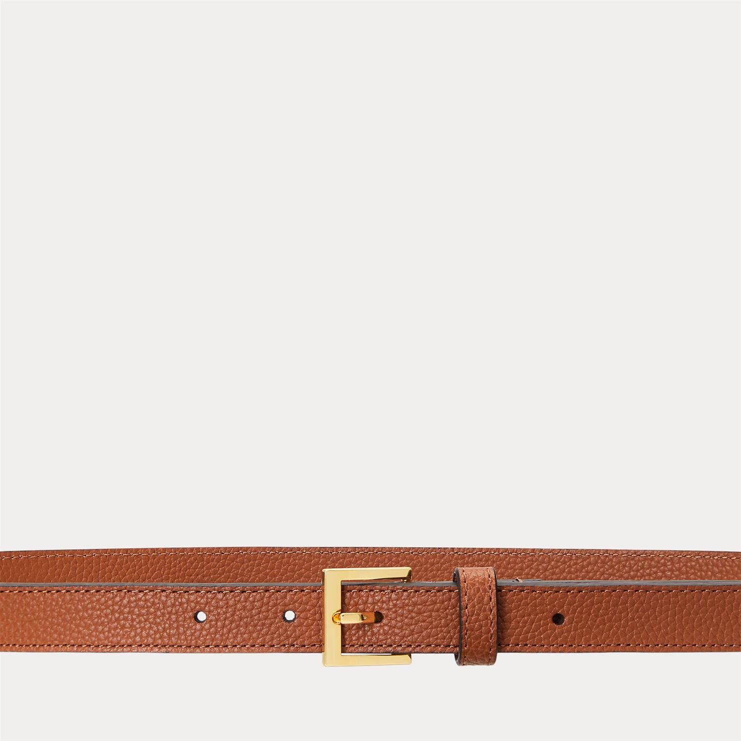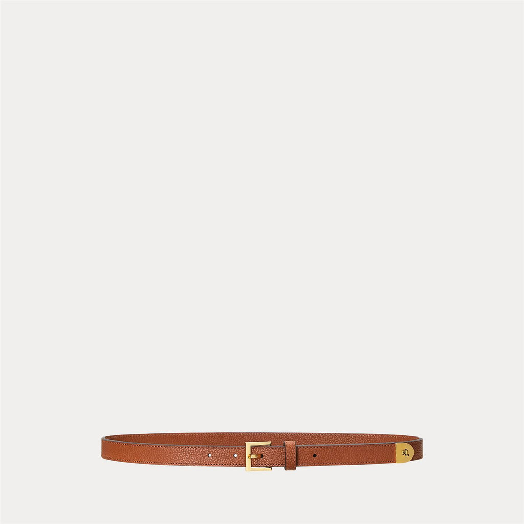 Luxurious pebbled leather brings subtle texture to this chic skinny belt, which features an “LRL”-engraved brass-finished tip for signature style.