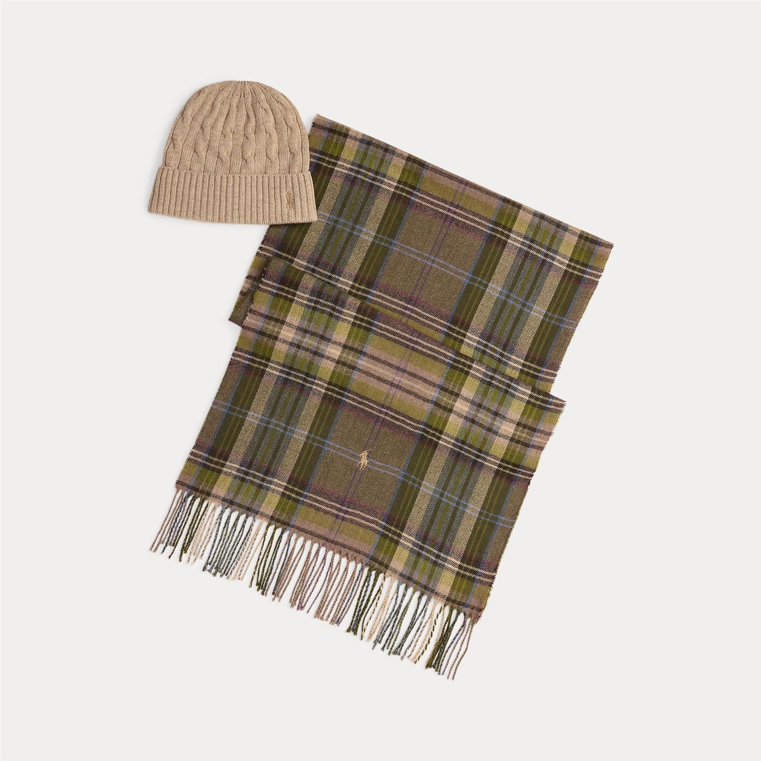 This gift set comes with a cable-knit wool-and-cashmere beanie and wool scarf that features a classic plaid pattern and fringe trim. Both pieces are accented by our embroidered Pony for a signature touch.