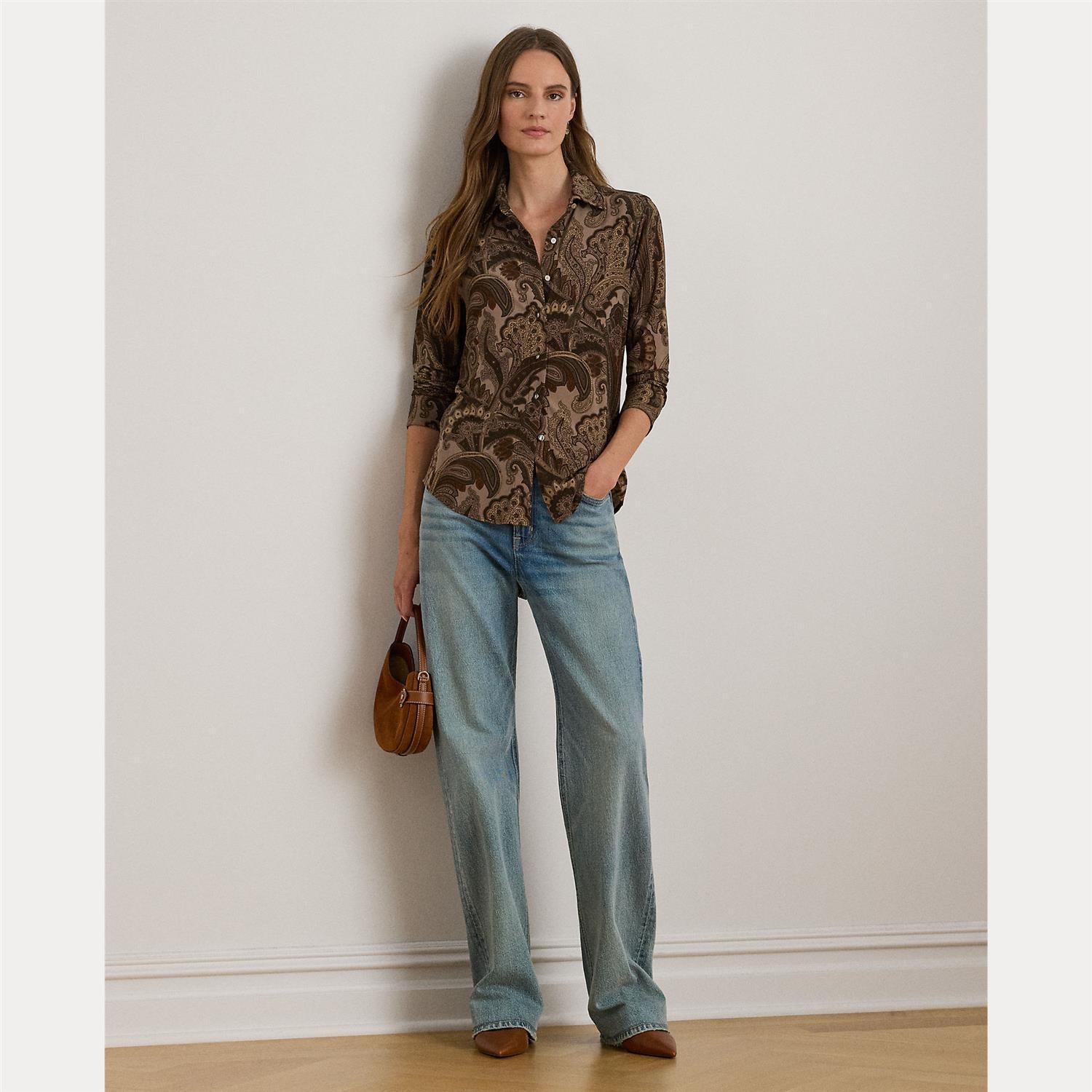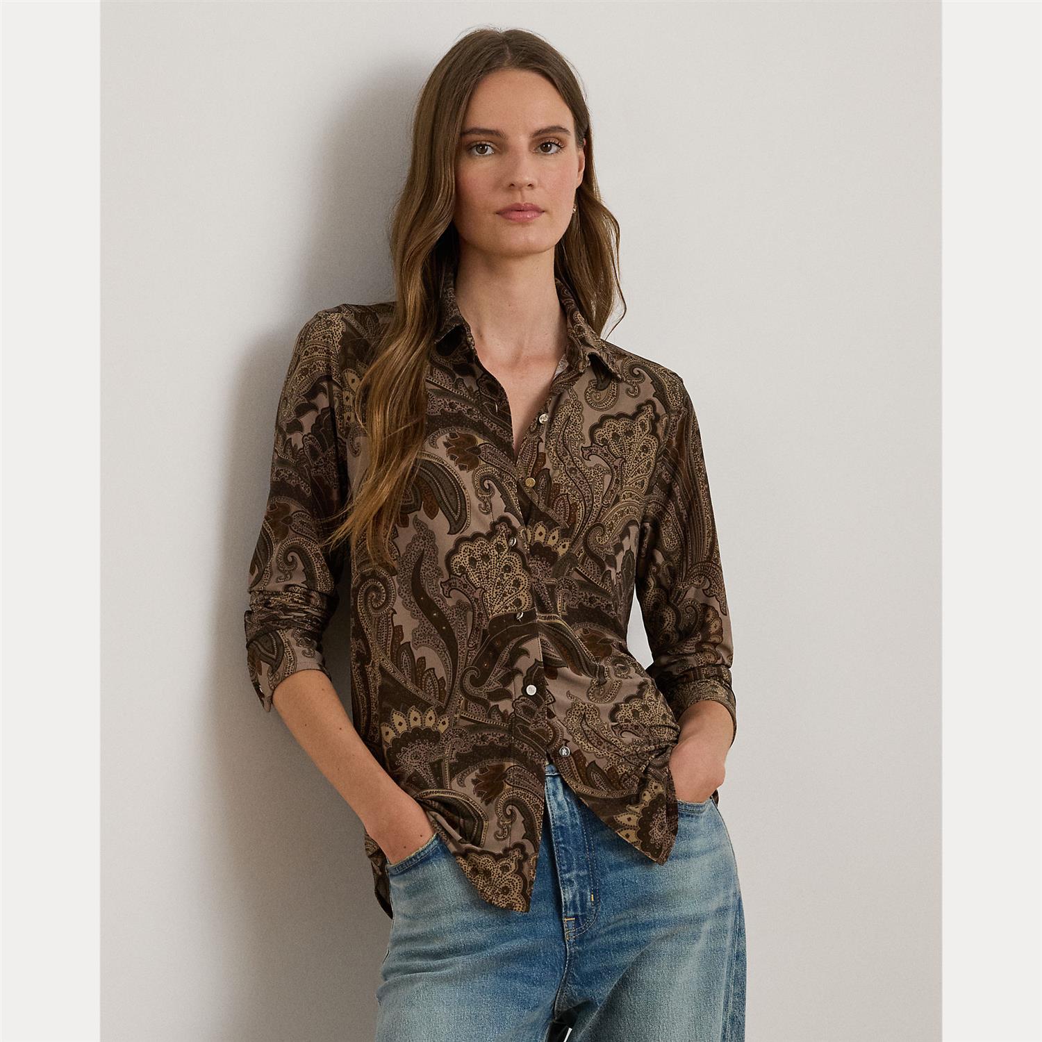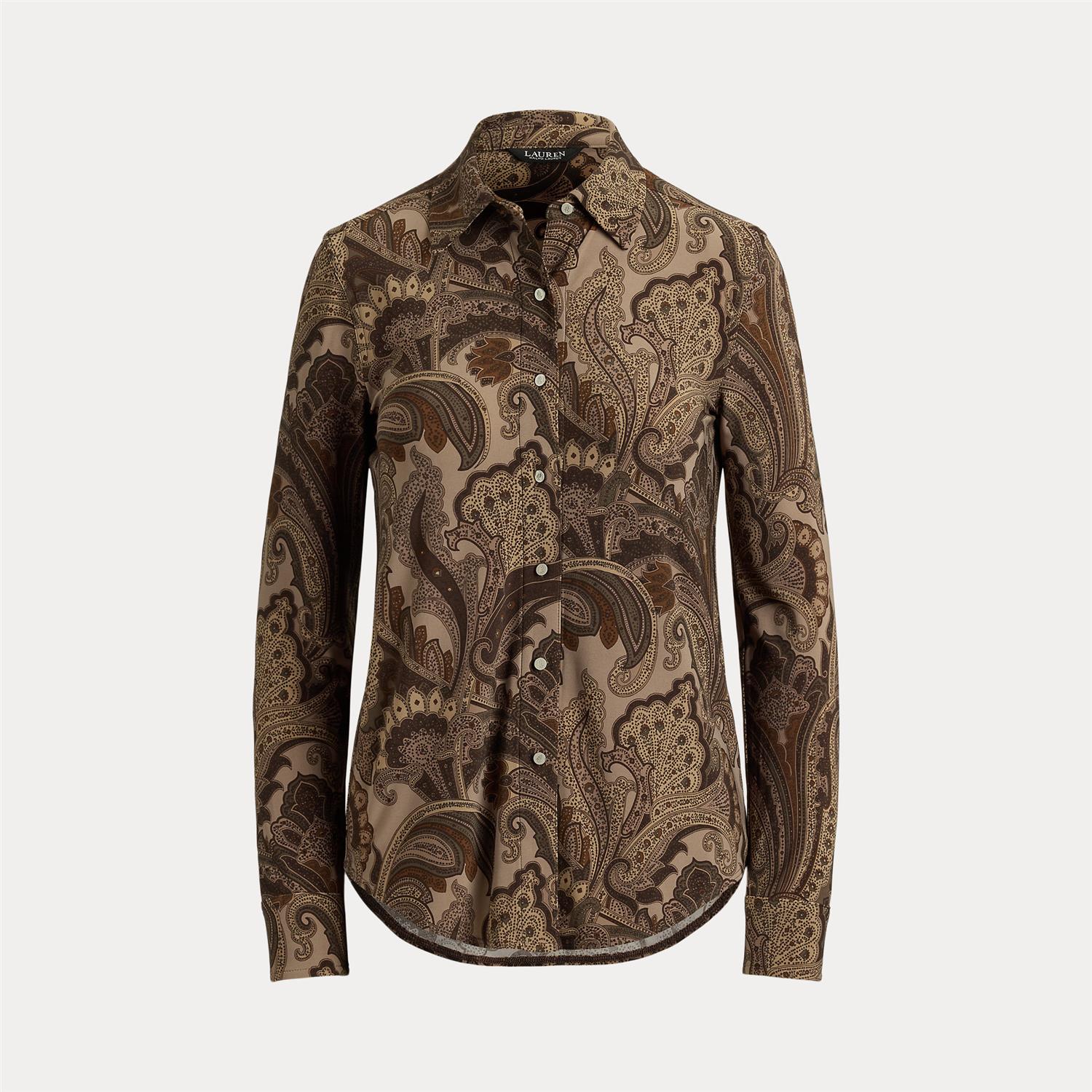 Crafted with stretch-infused jersey, this button-up shirt displays a paisley print in the season’s earthy color palette.