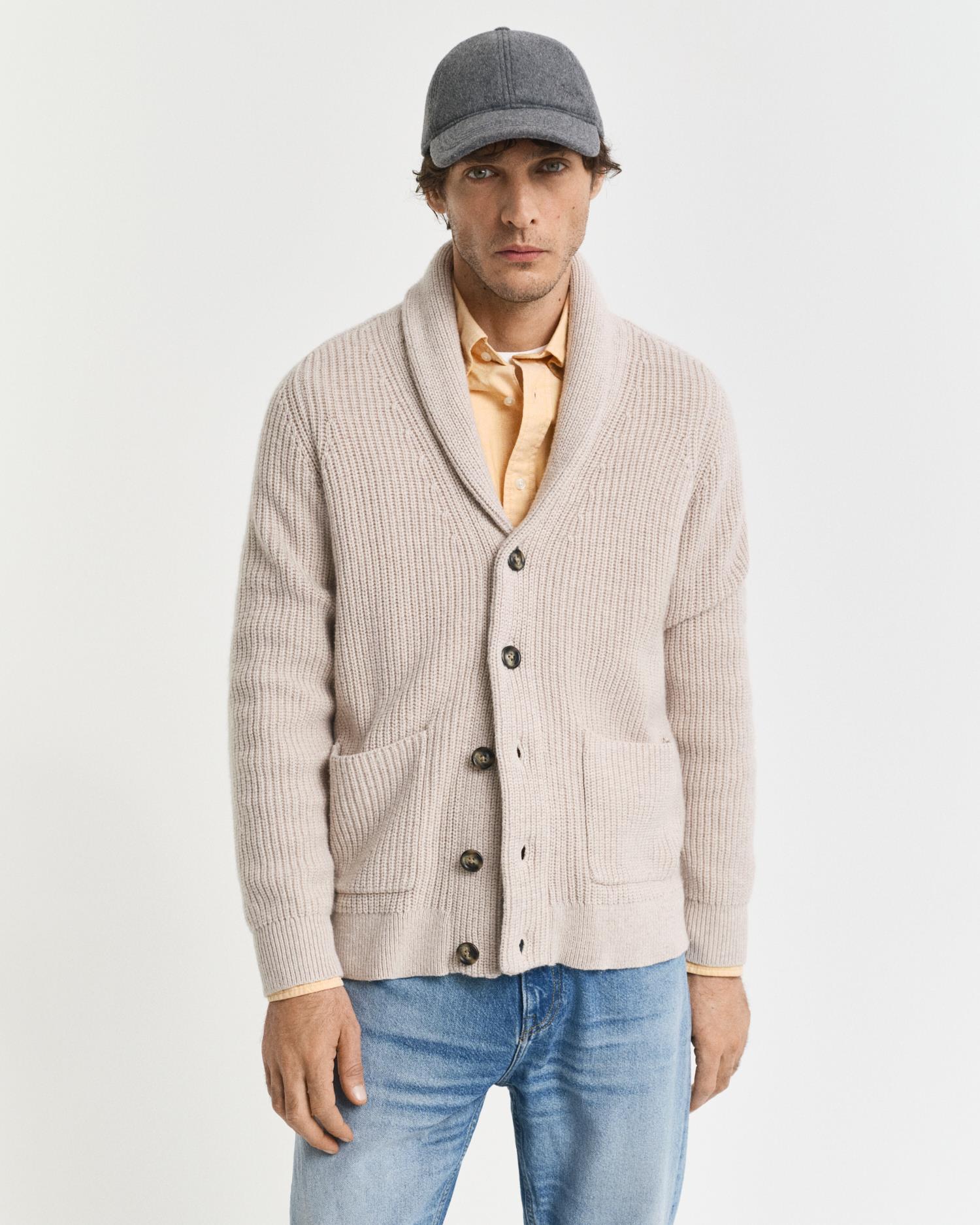 Denne cardiganen er ribbestrikket av en luksuriøs blanding av ull og bomull, og gir en avslappet passform. Den lukkes foran med knapper og har to strikkede lommer. Den sjalkragen gir et raffinert og smart utseende, perfekt for en uformell anledning.