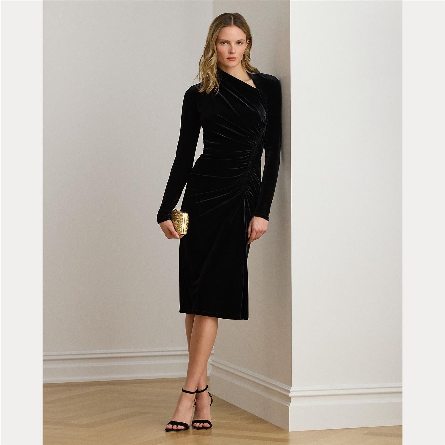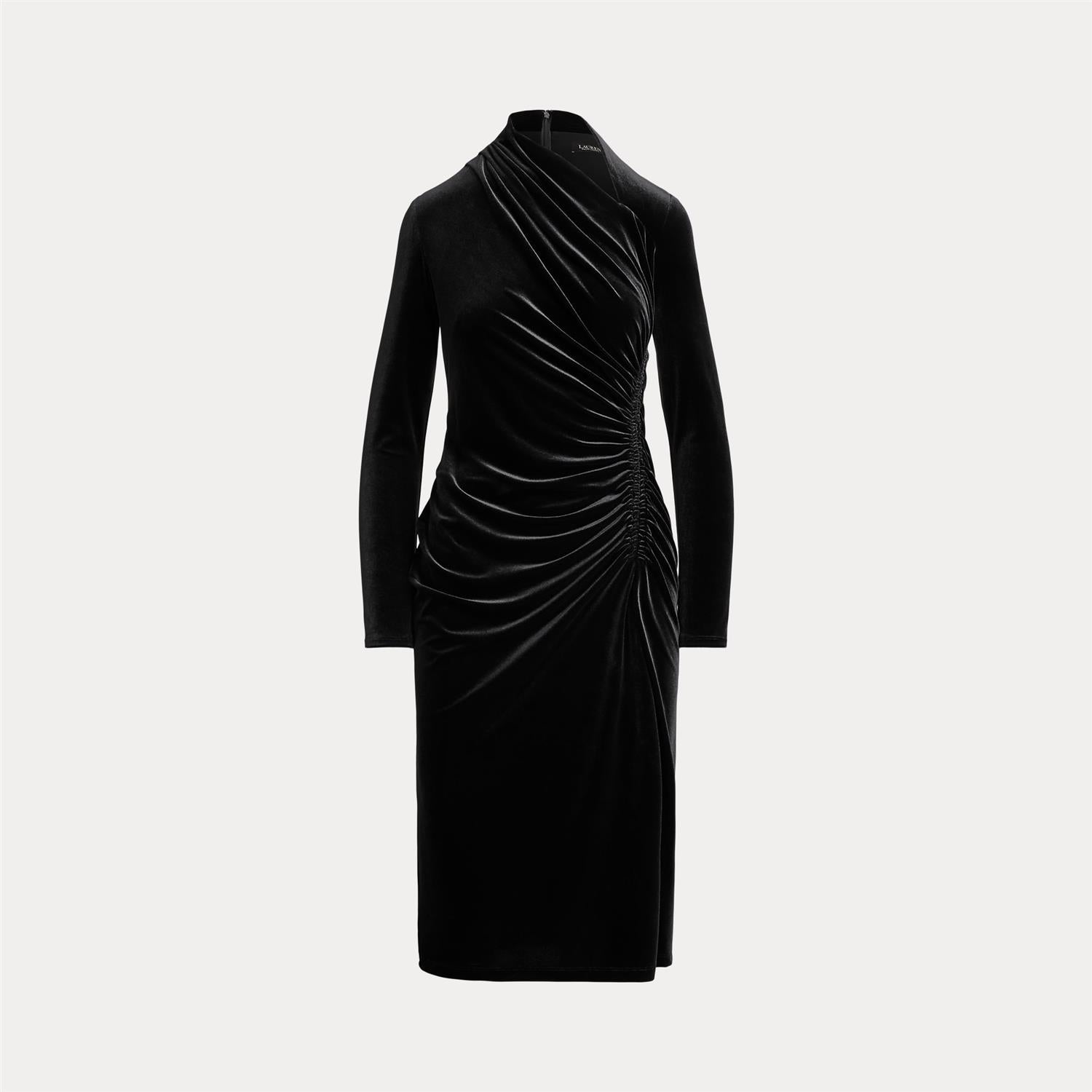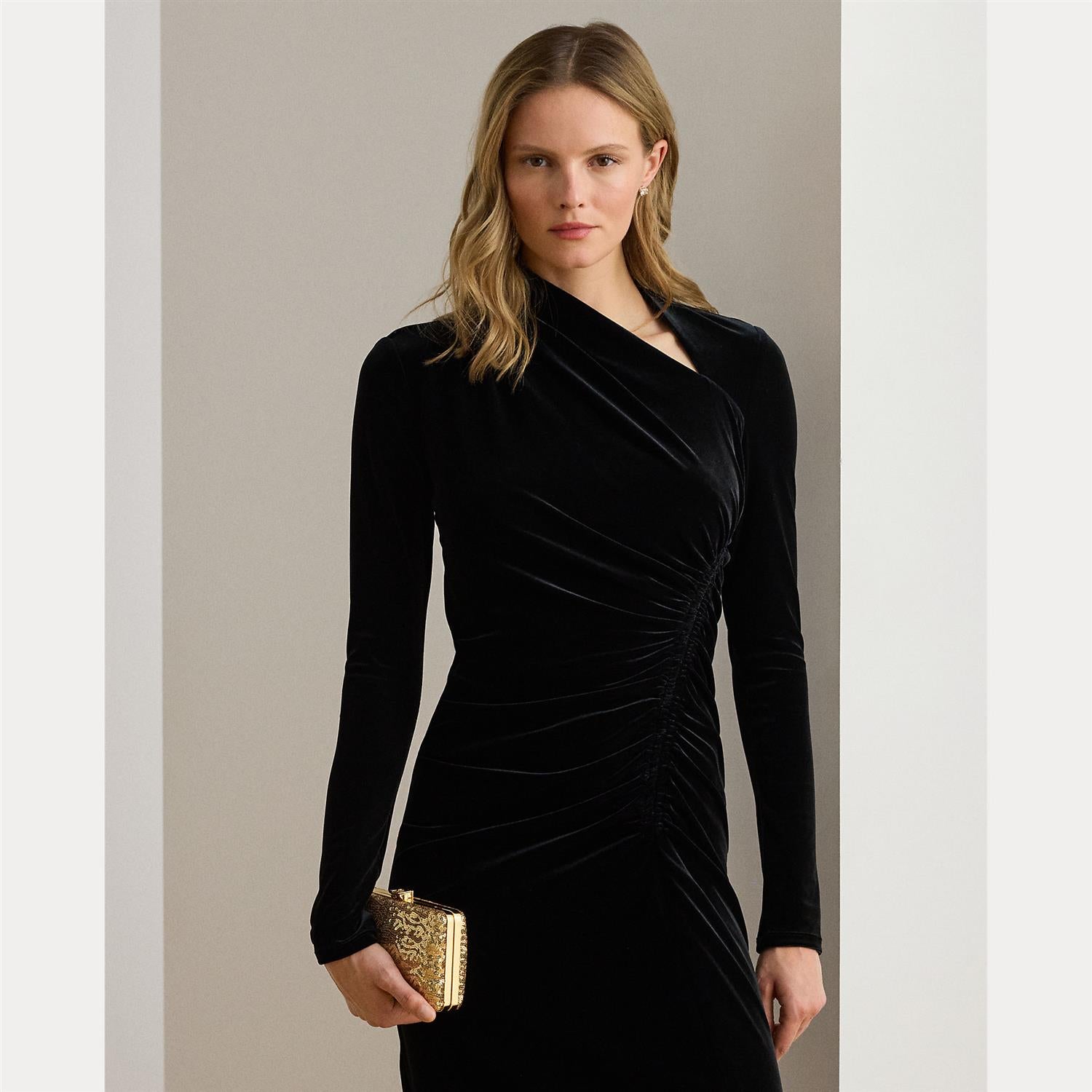 Rendered in soft velvet for a beautiful sheen, this dress embodies modern glamour with an asymmetrical neckline and front body ruching that accentuates its form-fitting sheath silhouette.