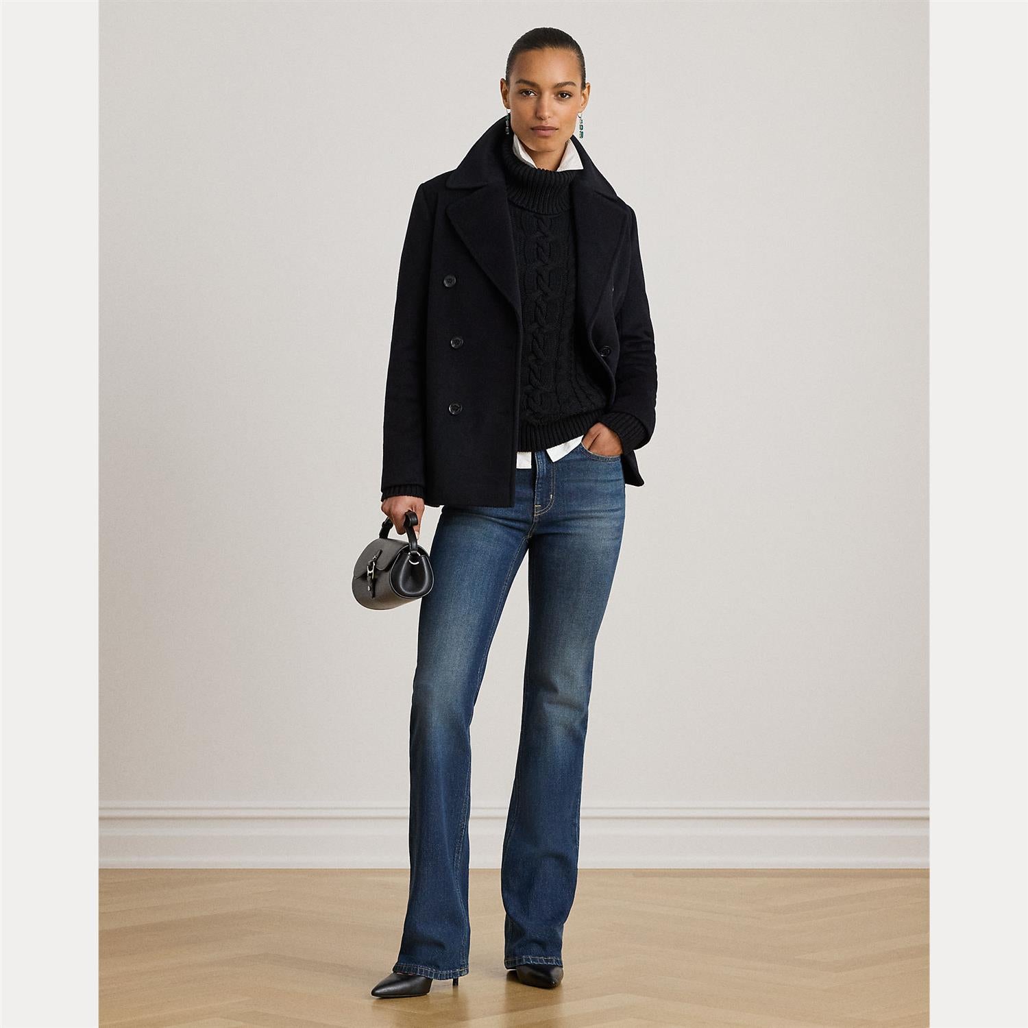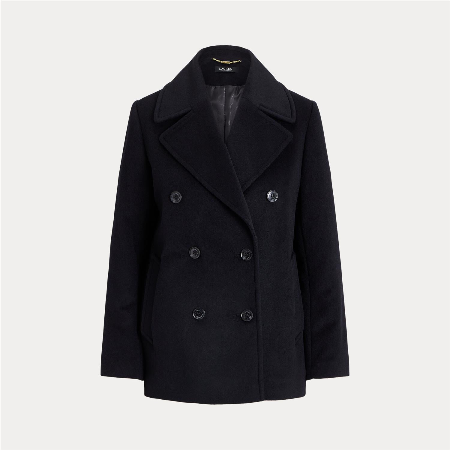 Tailored with a soft blend that includes wool and cashmere, this elegant coat showcases oversize notch lapels and a double-breasted silhouette with signature horn-effect buttons.