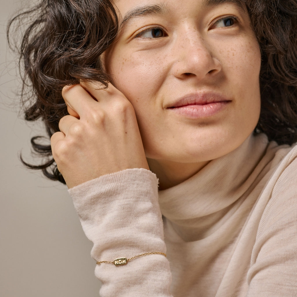 Om smykket:Det enkle Mam armbåndet i gull sier mer enn 1000 ord, for har vi ikke alle en mor vi gjerne vil gi anerkjennelse og takknemlighet. Mam armbåndet belagt med 18 karat gull er den opplagte gaven til en nybakt mor, din egen mor, en mor du ser opp til, eller hvilken som helst mor-figur. Historien er din. Mam armbåndet finnes også i sølv, og som halskjede og ring.